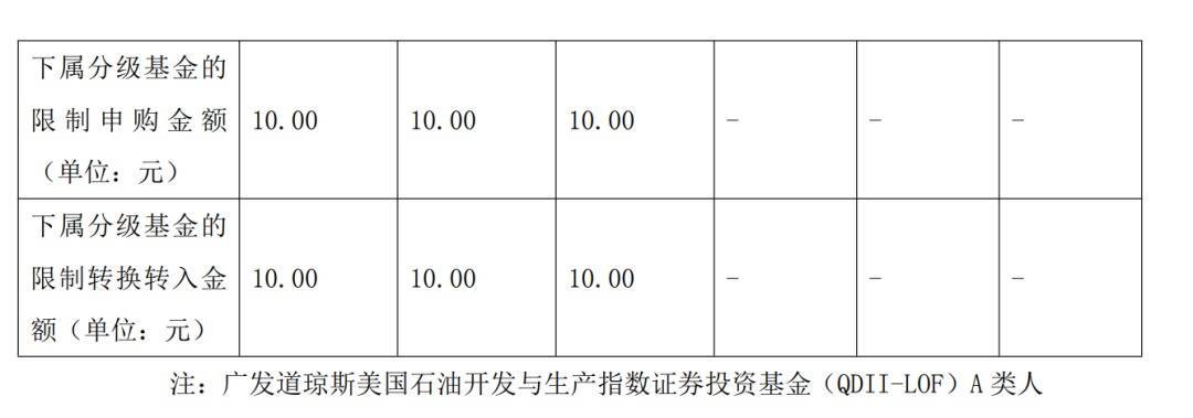 另外,广发基金决定,自2026年1月30日起,广发道琼斯美国石油开发与生产指数证券投资基金(QDII-LOF)人民币份额调整投资者单日单个基金账户申购(含定期定额和不定额投资)及转换转入本基金该类基金份额的业务限额为10.00元。