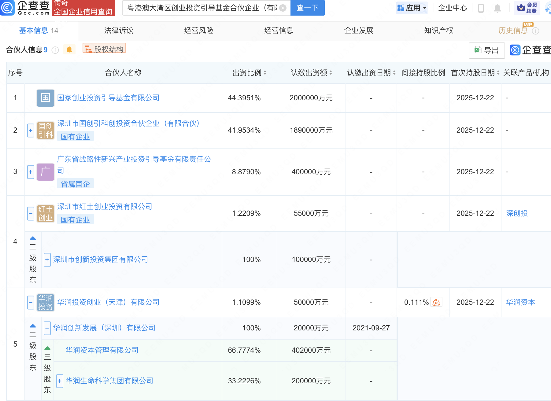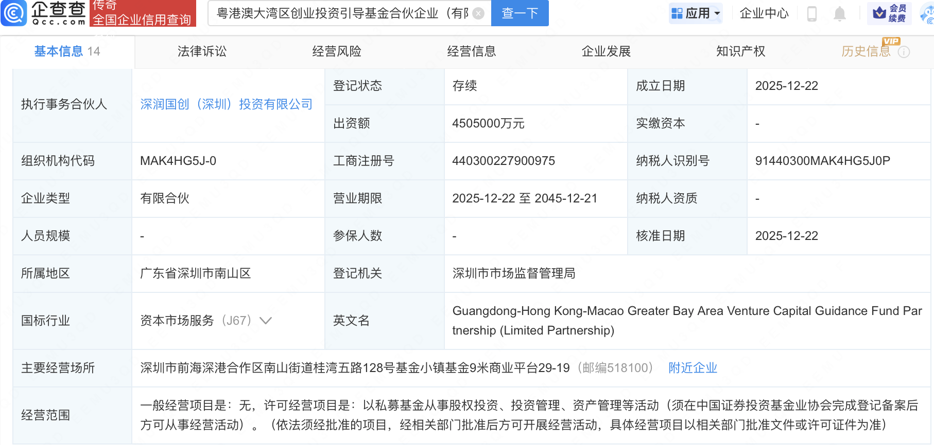 近日,粤港澳大湾区创业投资引导基金合伙企业(有限合伙)成立,出资额450.5亿元,经营范围包含:以私募基金从事股权投资、投资管理、资产管理等活动。企查查股权穿透显示,该企业由深圳市创新投资集团有限公司全资子公司深圳市红土创业投资有限公司、华润资本管理有限公司旗下华润投资创业(天津)有限公司等共同出资。